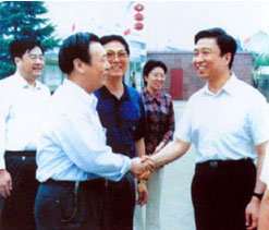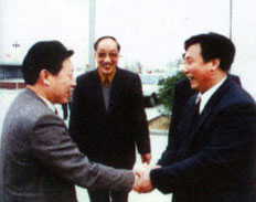 | 社會(huì )保障部鄭部長(cháng)(右一)在北京親切接見(jiàn)董事長(cháng) | 廣電部孫部長(cháng)(左一)來(lái)公司視察工作 |